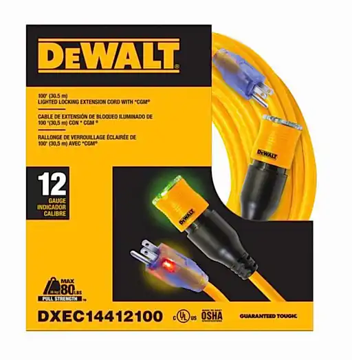 View full detailsDEWALT 12/3 Lighted Locking Extension Cord with CGM - 100 ft., Yellow